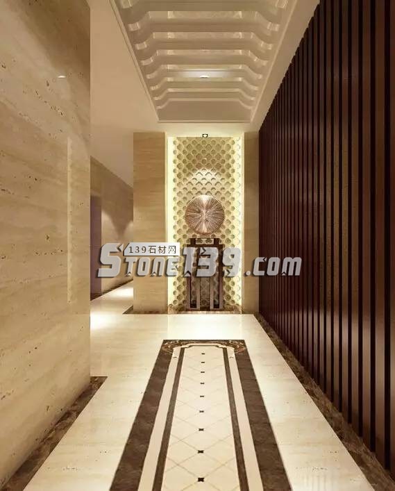 門廳處,以大量木制線條和石材及拼花蔓延出溫潤(rùn)休閑氣息,而漸暖的燈光則更是點(diǎn)睛之筆。