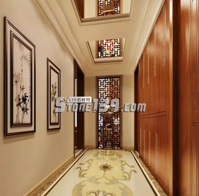 地面采用完整圖案的水刀拼花鋪設(shè),色彩分明,提升了空間的層次感。鏤空花窗的運(yùn)用,與整體中式的風(fēng)格相契合,滴水不漏,文竹花鳥的掛畫帶來(lái)濃郁的東方風(fēng)情。