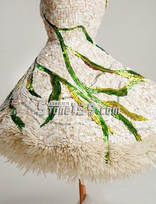 這條白色飾有綠色花紋的禮裙由大理石、玻璃馬賽克、鍍金馬賽克、玉髓及貝殼制作而成,講述了一個(gè)關(guān)于發(fā)生在墨西哥灣的美好事物消逝的故事,蔓延在裙子上的亞洲綠海帶實(shí)際上是一種墨西哥灣的入侵物種,它們對貝殼的生存環(huán)境造成了極大的影響。