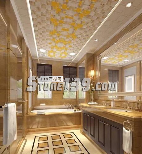 衛(wèi)浴以暖色吊頂為主,通過隨性的方式來完成馬賽克的經(jīng)典拼圖,營造了繁星點(diǎn)點(diǎn)般的自然浪漫氣息。吊頂?shù)牟馁|(zhì)和大理石的硬朗,完美呼應(yīng),成功凸顯空間質(zhì)感的大牌范。