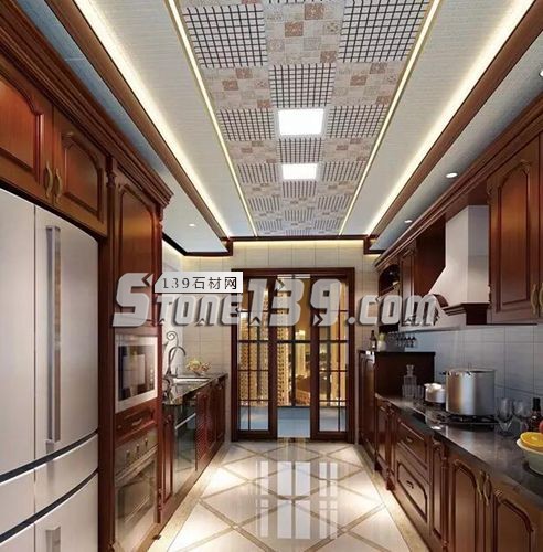 廚房空間相對(duì)較小,加上頂部吊頂,處理不當(dāng),則容易出現(xiàn)壓迫感,有悖“自由自在”的年輕心態(tài)。設(shè)計(jì)師創(chuàng)意將“馬賽克”融入吊頂設(shè)計(jì),幫助放大視覺、開闊空間。