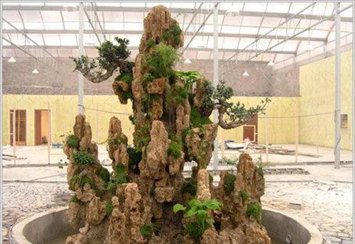 上水石的實(shí)質(zhì)是沙積石,暄而又脆,吸水性特別強(qiáng)。上水石由于暄而脆易于造型,可隨意鑿槽、鉆洞、雕刻出各式各樣的形狀。上水石天然洞穴很多,有的互相穿連通氣,小的洞穴如氣孔,這就是吸水性強(qiáng)的主要原因。在上水石上的洞穴中,填上泥土可植花。