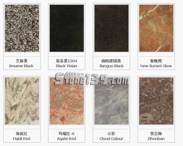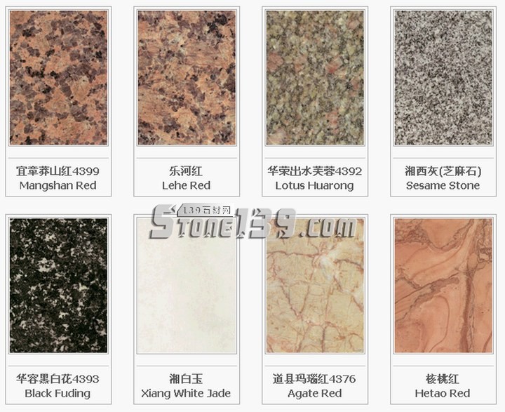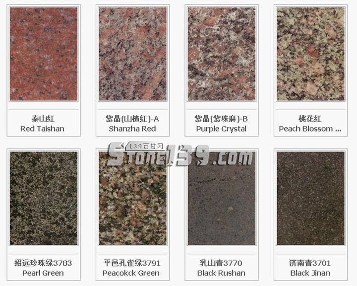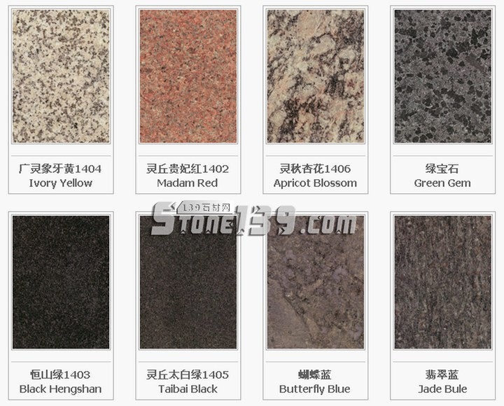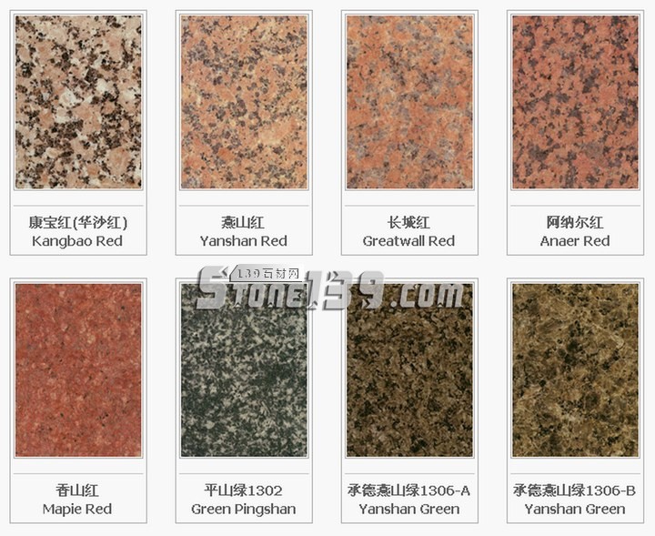 福建地區(qū):泉州白G606;虎貝紅G611;霞紅G681;洪塘白G614;銹石G682;芝麻黑G654;桃花紅G687;東石白G640;巴厝白G603;內(nèi)厝白G633;喬治亞灰G641;安溪紅G635;海滄白G623;羅源紅G664;福鼎黑G684;永定紅G696;禾山紅G617;同安白G655;安海白G3536;晉江清透白G615;康美黑G611;連城紅G666;連城花G3562;龍海黃玫瑰G3510;龍?zhí)锖657;虎皮白G3537;虎皮銹G3549;華安九龍壁G3576;南平黑G3553;閩江紅G3559;金沙黃G3569;百丈青G3577;浦城牡丹紅G3578;肖厝白G3516;櫻花紅G663;雪里梅G608;白金鉆G3590;斑礪紅G3517;寶金藍G3593;長樂紅G3575;陳山白G632;大洋青G3538;帝王灰麻G3546; 翡翠綠G3597;高源紅G3586;古典灰M3551;紅鉆麻G3520;金彩麻G3592;金鉆紅G3591;蘭寶春G3558;綠花白M3550;南平青G3539;南山青G3556;山花G3530;邵武青G3599;深灰G3531;圣誕綠G3594;武夷蘭冰花G3529;雪花青G3519;珍珠紅G3589;珍珠灰麻G3513;