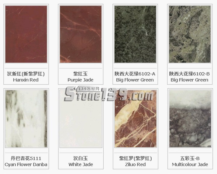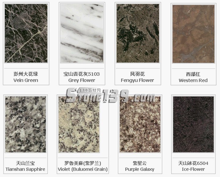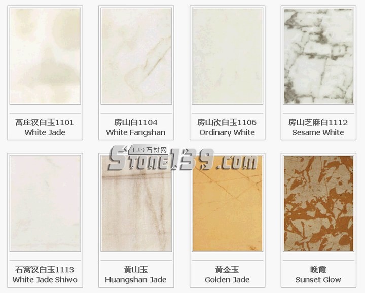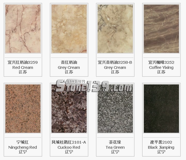 北京地區(qū):白虎澗紅G151;房山艾葉青M102;房山白M1104;房山次白玉M1106;房山高莊漢白玉M101;房山黃山玉M125;房山灰白G1154;房山螺絲轉(zhuǎn)M110;房山青白石M1116;房山石窩汗白玉M1113;房山桃紅M1107;房山銀晶M130;房山櫻紅;房山芝麻白M112;房山磚渣M1105;密云桃花G1152;霞云嶺青板石P1015;霞云嶺銹板石P1018;