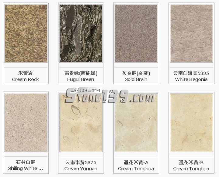 云南地區(qū)石材:冰花米黃M5328;東泰米黃M5354;河口白玉M723;黃土石M5355;綠斑豹G5360;木紋黃M5351;木紋砂巖SH5301;木魚石(紅) M5353;木魚石(黃)M5352;云南白海棠M725;