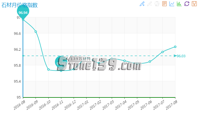 據(jù)系統(tǒng)監(jiān)測,8月份石材價(jià)格指數(shù)收報(bào)于96.26點(diǎn),環(huán)比上升0.13點(diǎn),上升約0.14%,本月石材價(jià)格紙指數(shù)繼續(xù)小幅上調(diào)。月價(jià)格同比指數(shù)為99.3點(diǎn),已較接近去年同期的價(jià)格。其中其他石材類價(jià)格繼續(xù)持平,花崗石類月價(jià)格小幅下調(diào),而大理石類及合成大理石類月價(jià)格均呈上升趨勢。從周價(jià)格指數(shù)走勢來看,本月石材周價(jià)格指數(shù)呈U型走勢,月中價(jià)格持續(xù)走低,至月底價(jià)格而又小幅回升。
