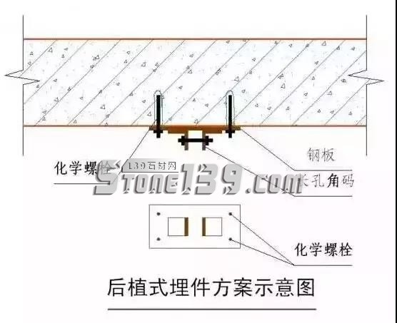 后植式埋件方案,要求鋼板和角碼先在工廠焊接加工,整體熱鍍鋅完成后,進(jìn)行現(xiàn)場(chǎng)安裝