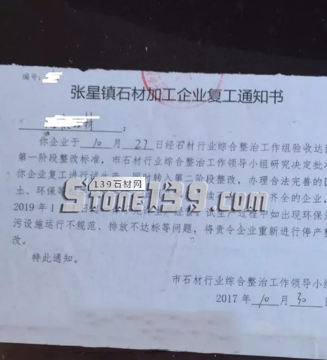 張星鎮(zhèn)石材加工企業(yè)復(fù)工通知書