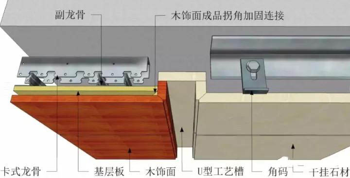 木飾面與石材交界邊緣如圖所示抽槽處理,石材壓木飾面,防止橫向工藝槽陰角處收口露空洞