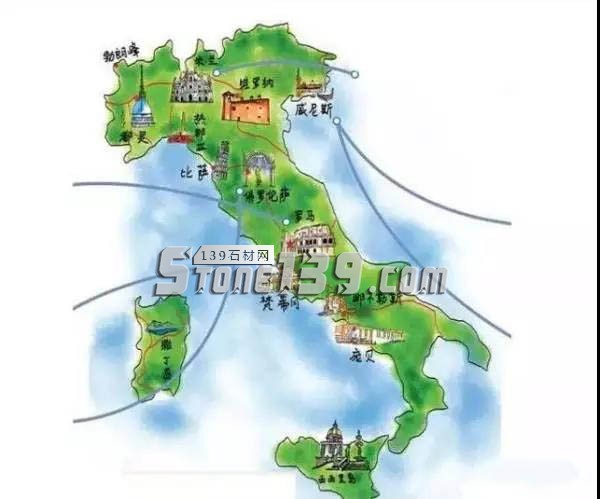 意大利石材資源極為豐富,生產(chǎn)礦點(diǎn)星羅棋布。特別是以卡拉拉為中心的西海岸和維羅納為中心的阿爾比斯山東段最為有名。前者主要產(chǎn)白灰色優(yōu)質(zhì)大理石;后者產(chǎn)深綠色、紅色和米色大理石。