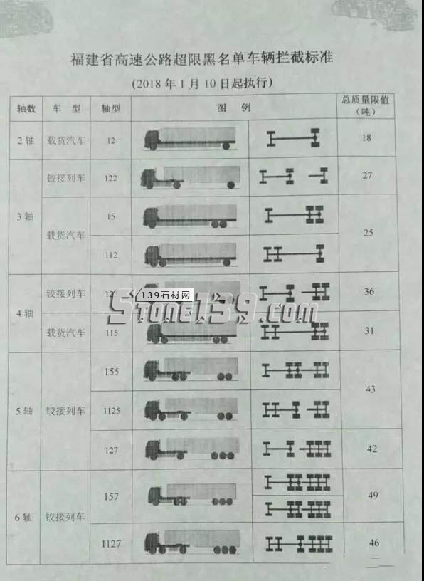 近日,有石材貨車司機(jī)提供了一張照片,上面顯示的是福建省高速公路超限黑名單車輛攔截標(biāo)準(zhǔn),該標(biāo)準(zhǔn)將從2018年1月10日起執(zhí)行。
