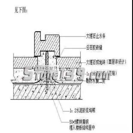 8) 淋浴房?jī)?nèi)施工找平層,找平層有一定強(qiáng)度后,將地漏堵住,在找平層上 進(jìn)行盛水試驗(yàn)收,盛水深度不小于80MM,盛水不少于4 天,如發(fā)現(xiàn)水 從淋浴房外出大理石縫里滲出,則應(yīng)進(jìn)行返工處理,將找找平層鑿除, 對(duì)防水節(jié)點(diǎn)進(jìn)行加強(qiáng);