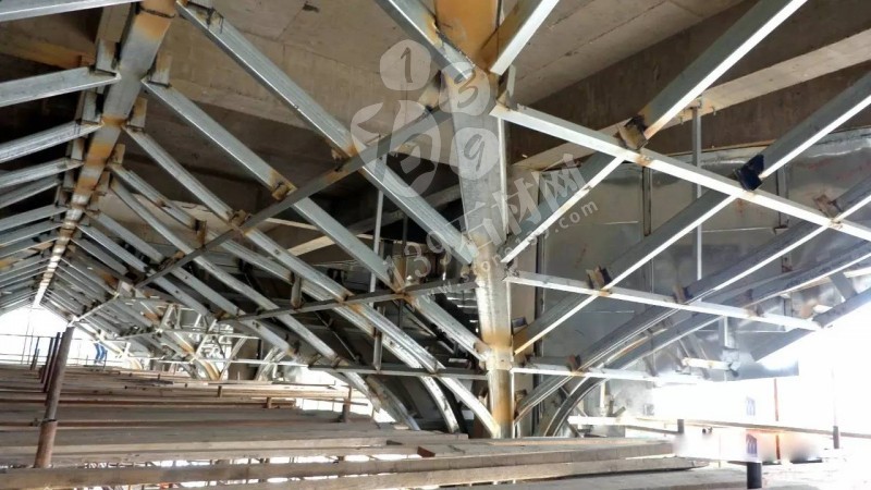 吊頂內(nèi)龍骨采用200×150鍍鋅方鋼和80×60×5方鋼,50×50×5角鋼縱橫交錯布置,其中80×60×5方鋼采用彎弧處理,鋁板采用3mm厚鋁板表面真石漆噴涂處理。