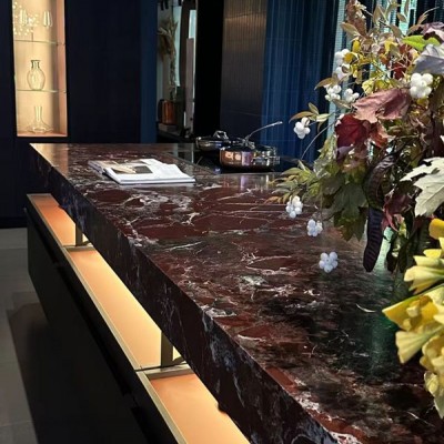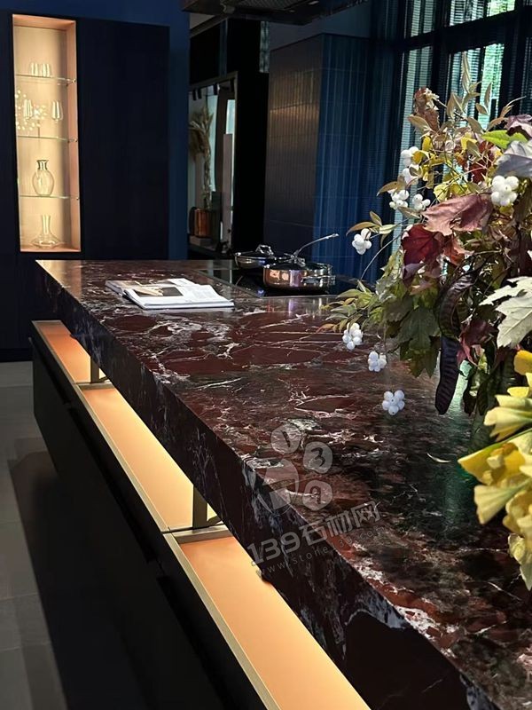 一、天然材質(zhì)的 “藝術孤品” 屬性 紫羅紅大理石的 深紅底色 + 白色脈絡 是天然形成的 “潑墨畫”: 紋理 獨一無二(每塊石材的白紋走向、疏密都不同),自帶 “高定孤品” 的稀缺感; 表面 高光質(zhì)感 如鏡面,折射光線時,白紋會隨角度變化呈現(xiàn) “流動感”,仿佛將地質(zhì)運動的韻律凝固在臺面。 二、色彩與氛圍的 “沖突平衡術” 紅與黑 / 藍的底色呼應: 大理石深紅底色,與背景深色柜體(深藍、黑色)形成 同色系層次對比(深紅更鮮艷,柜體更暗沉),既統(tǒng)一調(diào)性,又避免單調(diào)。 白紋與花藝的細節(jié)呼應: 石材中的白色脈絡,與花藝里的 白色漿果、淺色葉片 形成視覺串聯(lián),讓 “硬” 的石材和 “柔” 的植物產(chǎn)生對話,中和了大理石的厚重感。 三、燈光設計的 “點睛魔法” 島臺下方的 嵌入式暖光(琥珀色) 是關鍵: 懸浮感營造:從底部照亮石材邊緣,讓厚重的大理石臺面 “懸浮” 起來,削弱物理重量感; 紋理強化:暖光打亮石材底部,使白紋的立體感更突出,宛如給紋理 “加了高光”; 氛圍升溫:暖光中和了深紅的冷冽,讓空間多了份 溫潤的奢華感(區(qū)別于冷光的 “距離感”)。 四、功能與藝術的 “雙重敘事” 社交核心的 “視覺錨點”: 島臺是廚房 / 客廳的社交中心,紫羅紅大理石以 強烈的視覺沖擊 成為空間 “C 位”,擺放書籍、花藝后,從 “操作臺面” 升級為 藝術展示臺,承載交流、打卡、審美體驗等多重功能。 “剛?cè)岵?的氣質(zhì)適配: 大理石的 硬朗質(zhì)感(天然石材的剛性),與周圍玻璃柜(通透)、布藝窗簾(柔軟)、金屬器具(精致)搭配,形成 材質(zhì)混搭的平衡美學,讓空間既有 “高端氣場”,又不失生活溫度。 這種設計將紫羅紅大理石的 天然藝術感 與 空間需求 深度融合:既利用它的 “吸睛力” 打造焦點,又通過色彩、燈光、搭配弱化其 “厚重感”,最終實現(xiàn) “奢華不壓抑,實用又藝術” 的高階美學表達。