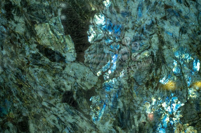藍翡翠的局部紋理極具 **“星河碎鉆感”:以深邃的灰黑色為基底,內(nèi)嵌大量藍色、青綠色的閃光晶體,這些晶體如 “極光碎片” 般分布,在光線照射下呈現(xiàn)出變幻的虹彩效應(yīng) **—— 從不同角度可看到藍、綠、金等色的跳躍式閃光,仿佛將宇宙星河壓縮進石材紋理中。同時,黑色云母與金屬礦物的交織形成 **“脈絡(luò)狀紋理”**,如深海暗流般穿梭于藍色晶體之間,讓局部紋理既有 “寶石的璀璨”,又有 “地質(zhì)紋理的野性張力”。
