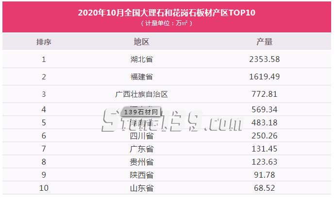 國(guó)內(nèi)各省石材產(chǎn)量排名專題主要介紹2020年國(guó)內(nèi)各省的產(chǎn)量排名,平時(shí)大家了解的是石材市場(chǎng),比較大的石材市場(chǎng)大家都比較清楚,比如福建的水頭,廣東云浮,山東萊州,湖北麻城、隨州、河南南陽、四川達(dá)州、廣西岑溪等等。但是論產(chǎn)量2020年最新的前十個(gè)月數(shù)據(jù)顯示湖北、福建、廣西、是前三位的。而且湖北產(chǎn)量一騎絕塵,差不多是第二位福建和第三位廣西的總和。后面7位分別是河南、湖南、四川、廣東、貴州、陜西、山東。
