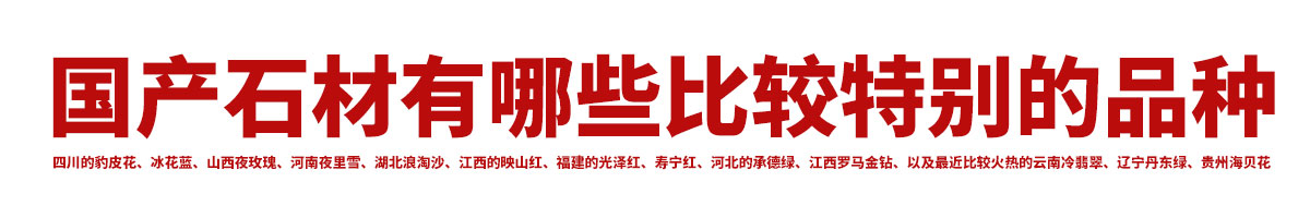 國產(chǎn)石材有哪些比較特別的所謂特別的國產(chǎn)石材就是區(qū)別于市面上常見的芝麻黑、中國黑、芝麻白、芝麻灰、蝦紅銹石一類的天然花崗巖產(chǎn)品系列。比如四川的豹皮花、冰花藍(lán)、山西夜玫瑰、河南夜里雪、湖北浪淘沙、江西的映山紅、福建的光澤紅、壽寧紅、河北的承德綠、江西羅馬金鉆、以及最近比較火熱的云南冷翡翠、遼寧丹東綠、貴州海貝花等等。這里主要以花崗巖為主,大理石主要考慮到紋路變化大,同一個品種都有可能千差萬別,唯一的區(qū)別就是按色系來分類,有幾個不常見的顏色,比如藍(lán)色、綠色、這也是這個石材比較火的原因,大理石常見的色系主要有黑白灰、還有米黃色系。鮮艷顏色色系的相對少見。改期再仔細(xì)介紹。這期以花崗巖為主打。介紹出黑白灰紅黃之外的幾個不同花色的產(chǎn)品。典型代表有映山紅、豹皮花、承德綠、羅馬金鉆高湖石等等。